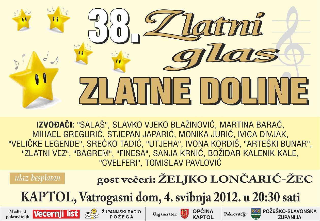 38. Zlatni glas zlatne doline održat će se 04.05.2012. godine s početkom u 20:30 sati u vatrogasnom domu u Kaptolu. Ulaz za sve posjetitelje je besplatan.